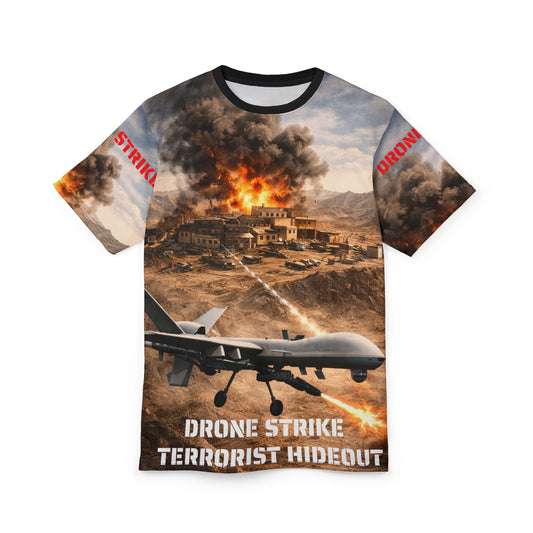 All-Over Print Tee — "Drone Strike Against Terrorist Training Facility" Graphic
