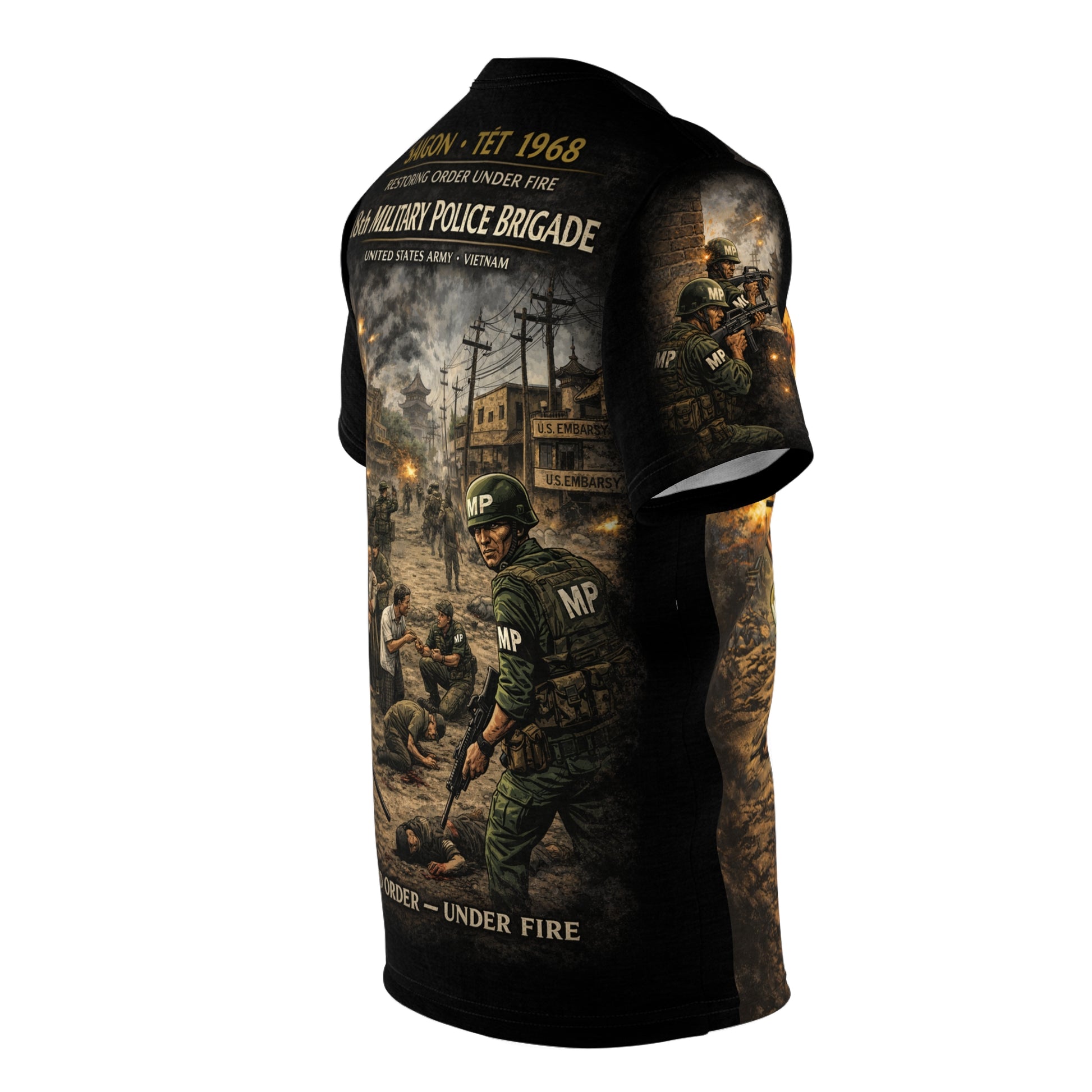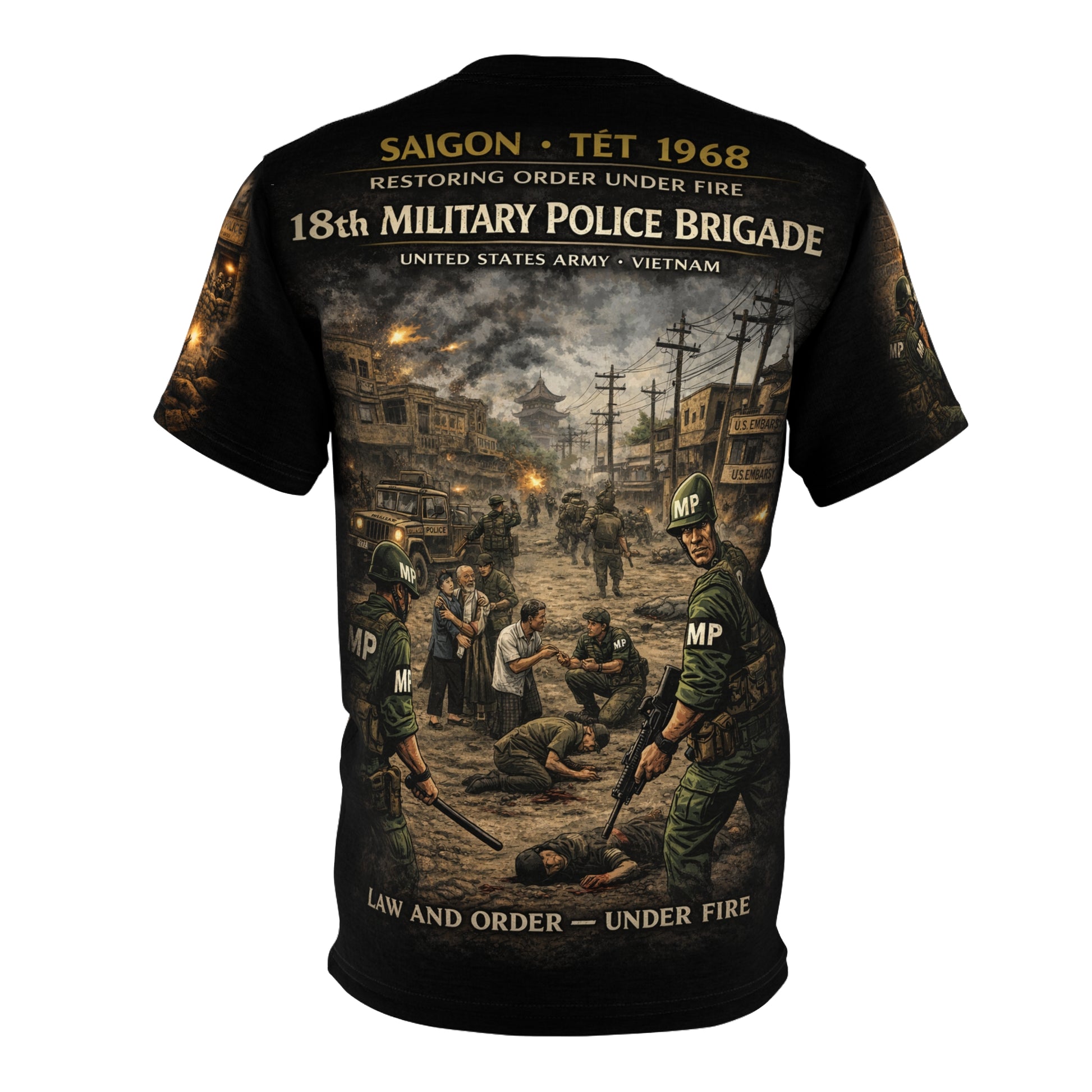 This 18th Military Police Brigade Tribute Tee honors the military police who stood firm during the Tet Offensive of 1968, one of the most intense and pivotal campaigns of the Vietnam War. Featuring "Taking Back Control" design that captures the resolve and determination of MPs who maintained order during chaos, this premium all-over print tee transforms Vietnam War legacy into dignified everyday wear — steady, respectful, and built to last.