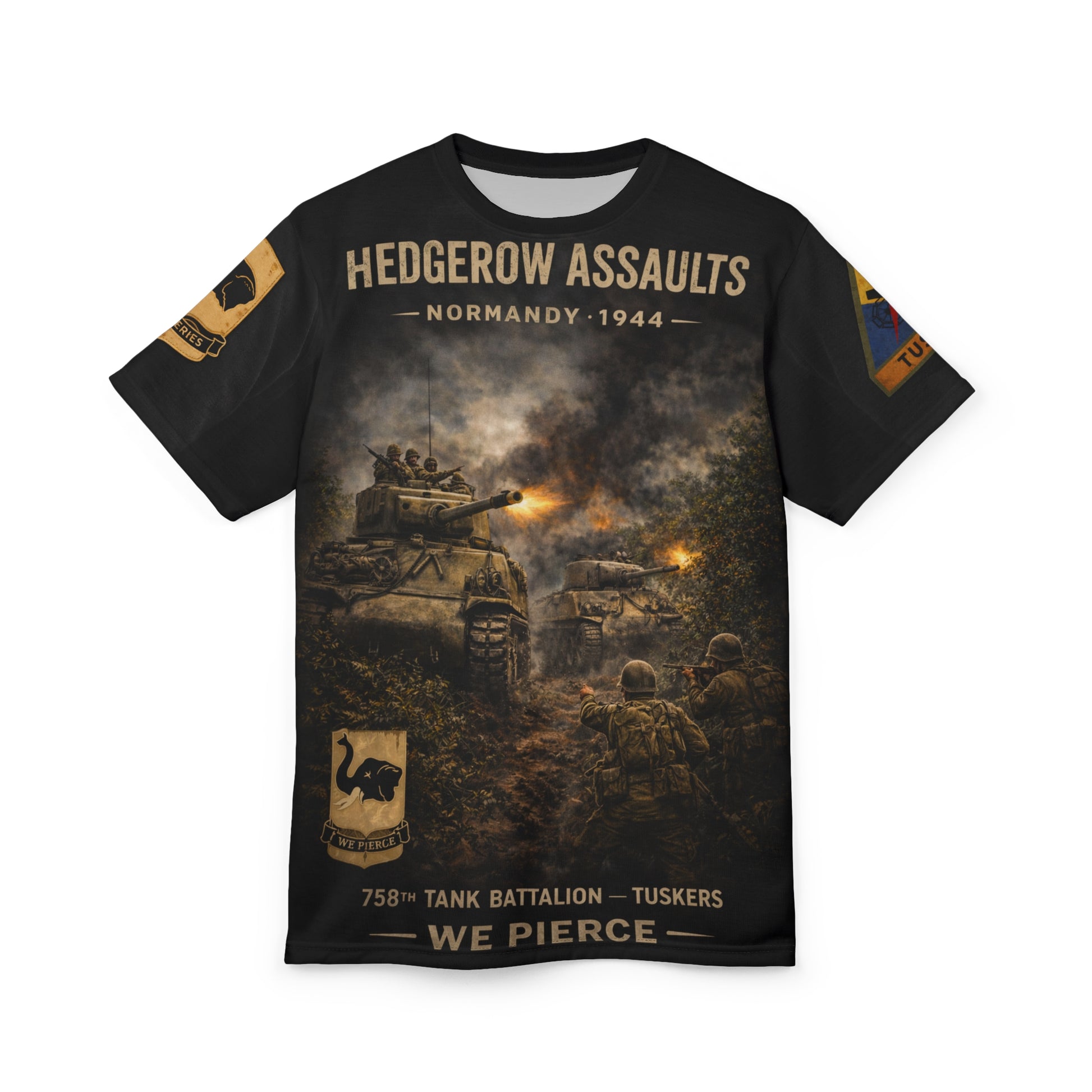 This premium all-over print tee honors the 758th Tank Battalion — the "Tuskers" — one of the first African American tank battalions to see combat in World War II. Landing in Normandy in October 1944, the Tuskers faced the brutal hedgerow fighting that defined the Battle of Normandy, supporting infantry operations and proving their courage in some of the war's most challenging terrain.