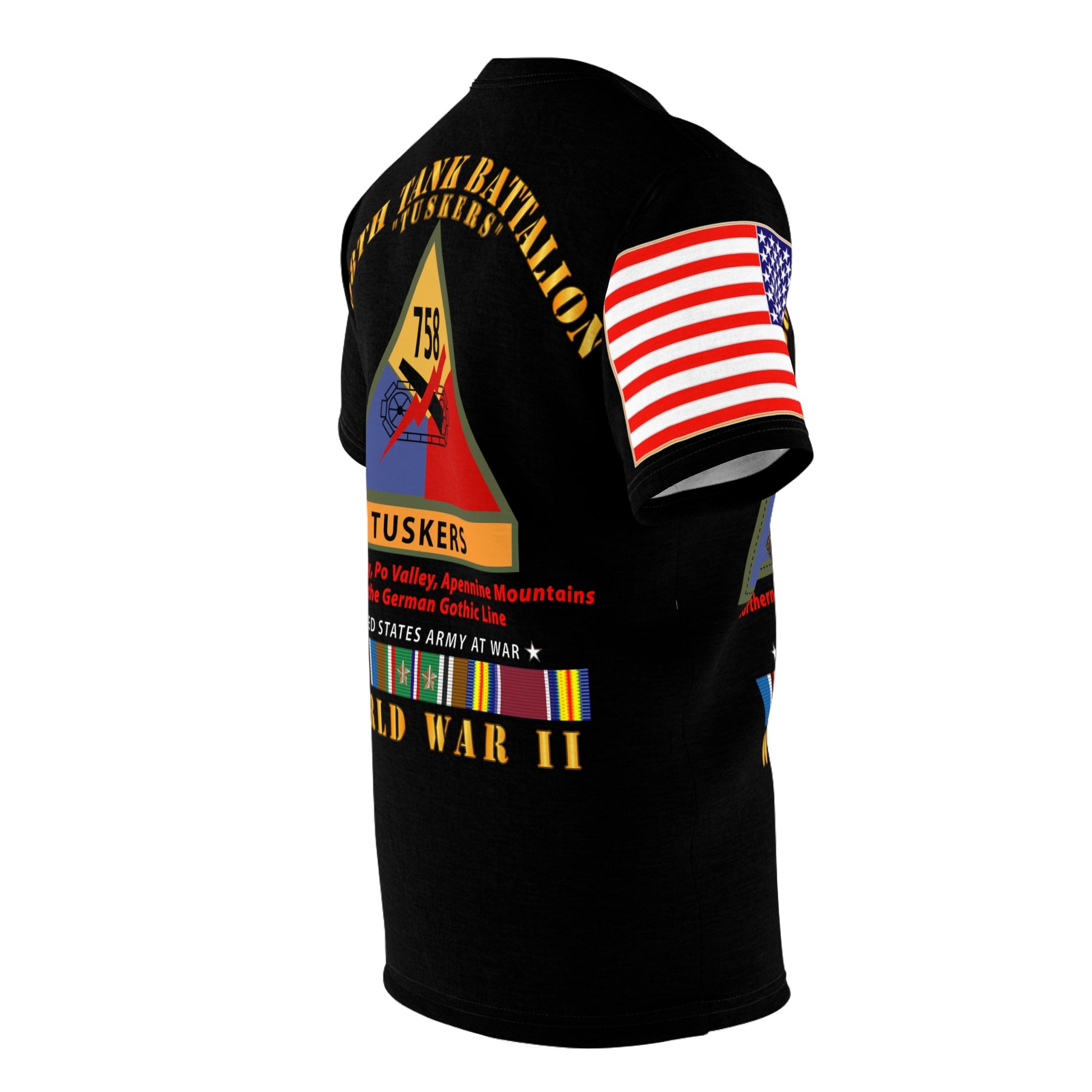 All Over Print - Army - 758th Tank Battalion - WWII - Tuskers .: 100% Polyester .: Light fabric (6.0 oz/yd² (170 g/m²)) .: Regular fit .: Runs true to size