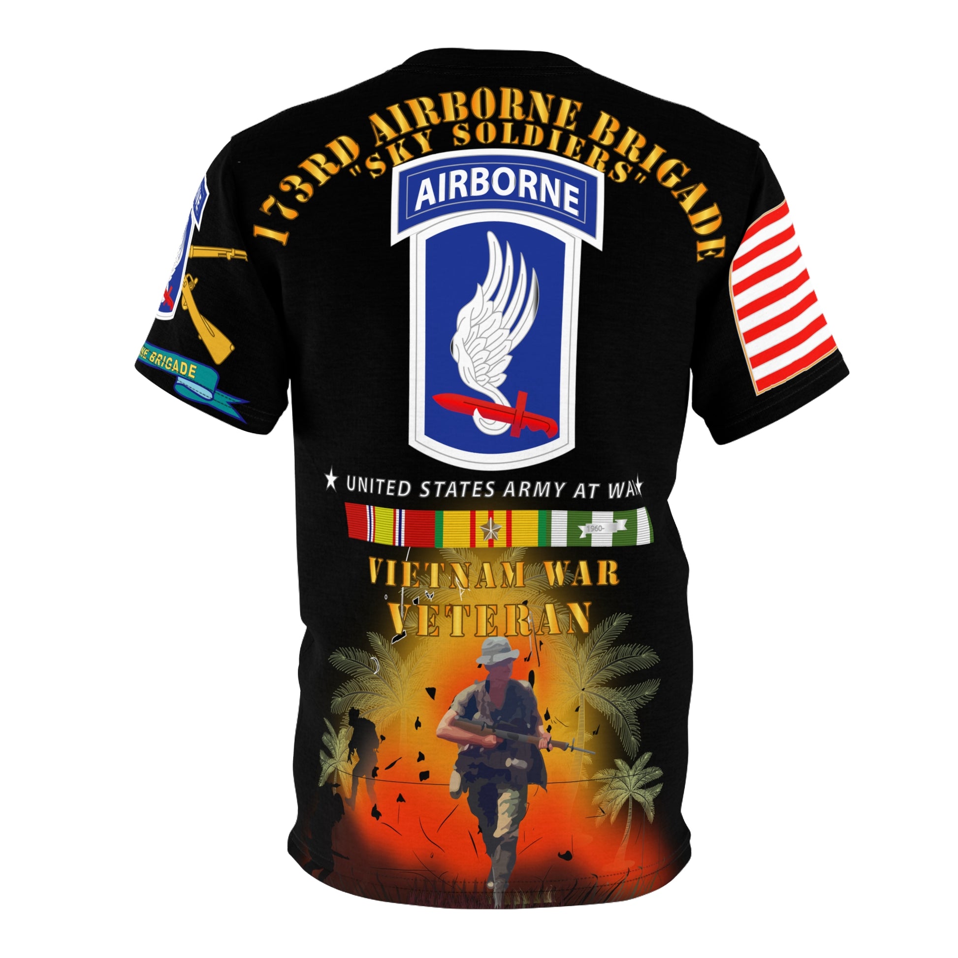 AOP - Army - 173rd Airborne Brigade - Vietnam Veteran - Oval, Combat Jump Star with Vietnam Service Ribbons .: 100% Polyester .: Light fabric (6.0 oz/yd² (170 g/m²)) .: Regular fit .: Runs true to size