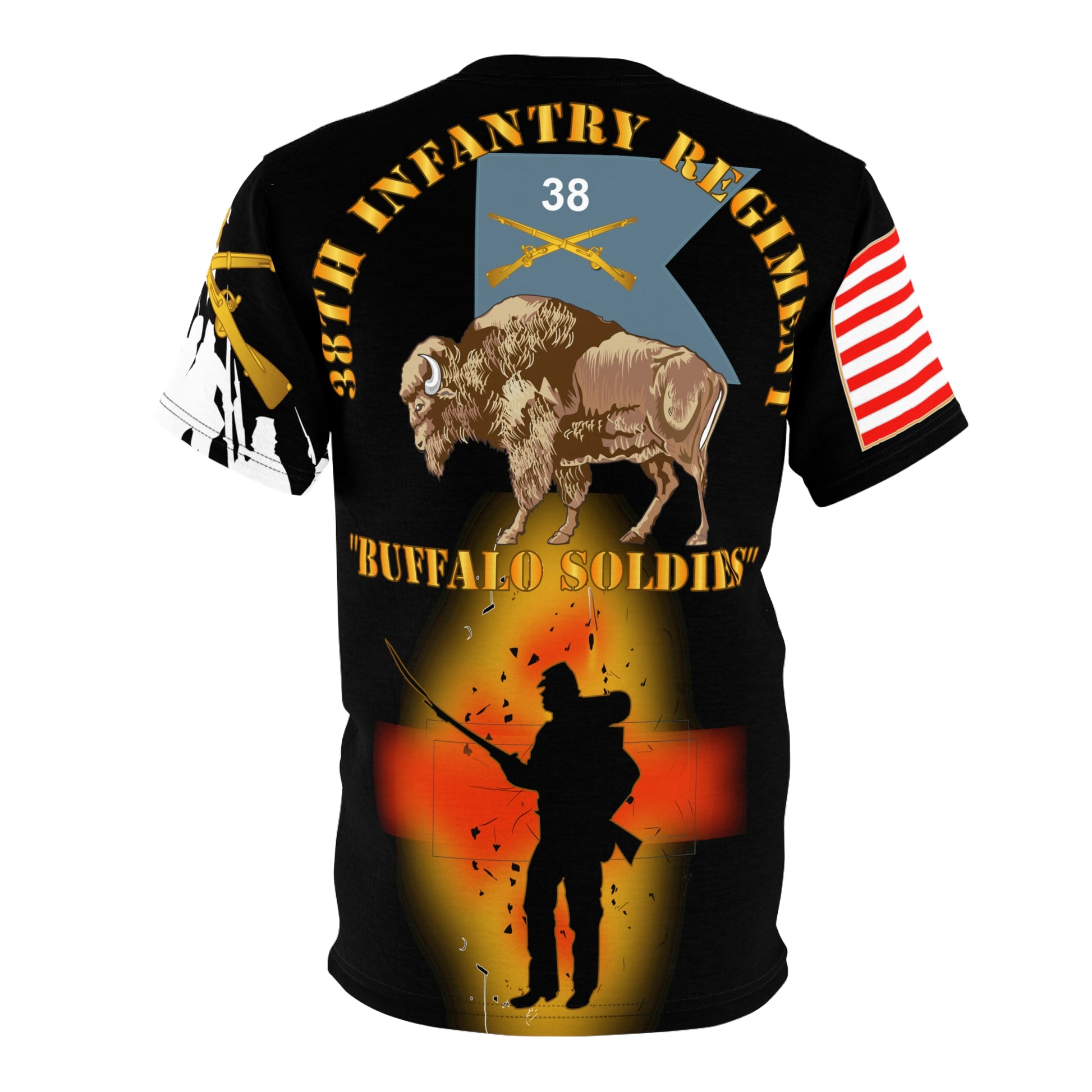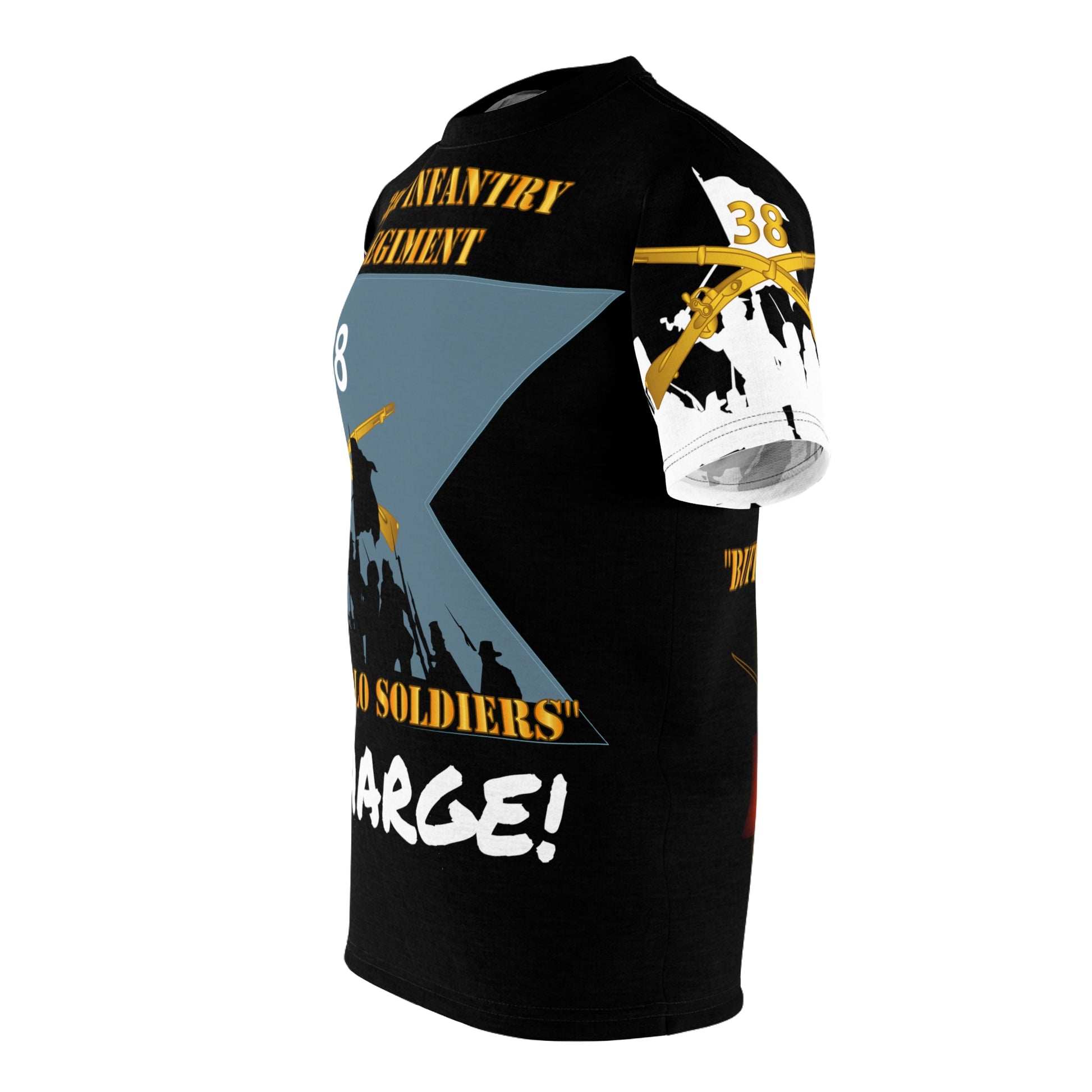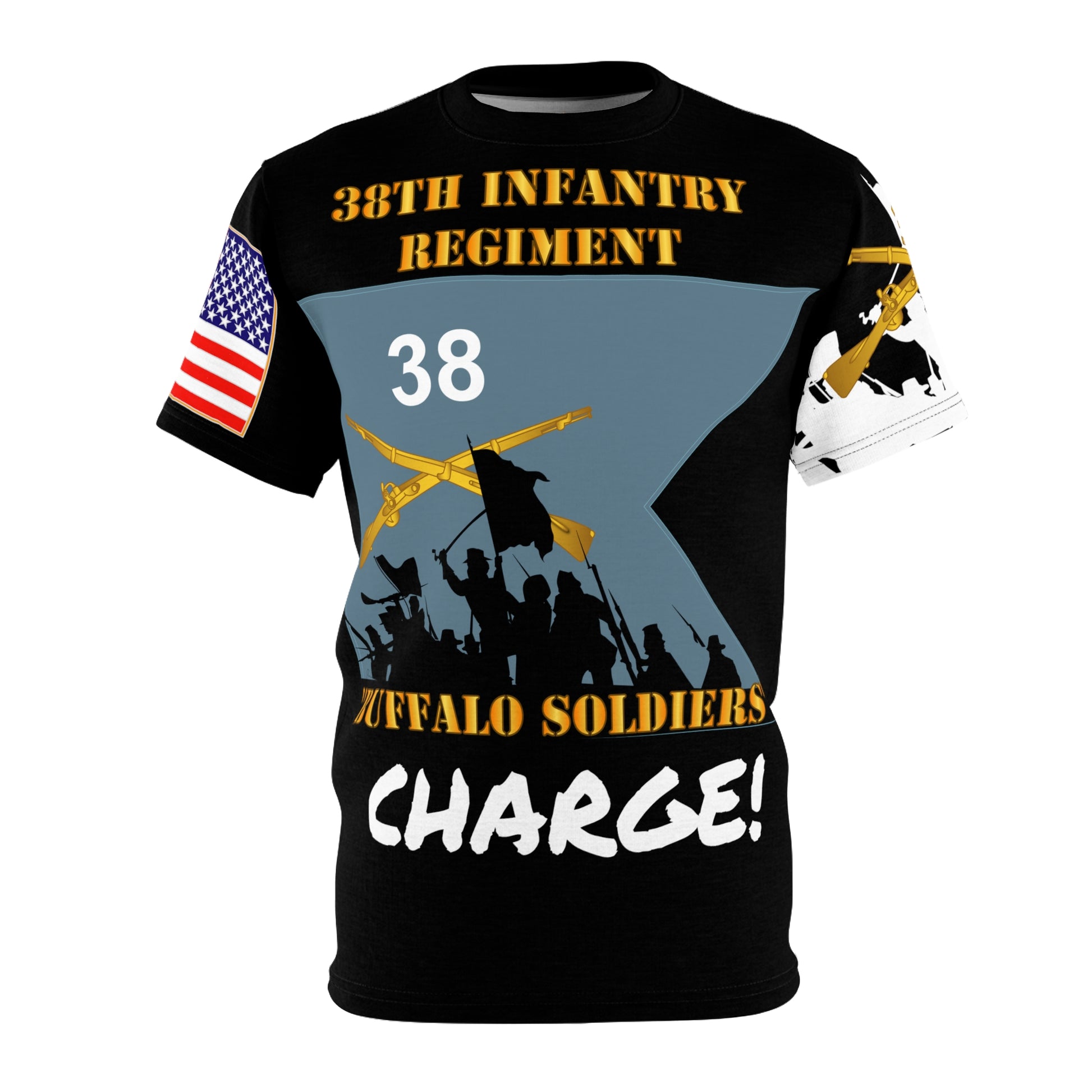 AOP - Army - 38th Infantry Regiment on Guidon with Bayonet Charge - "Buffalo Soldiers" .: 100% Polyester .: Light fabric (4.0 oz/yd² (113 g/m²)) / (6.0 oz/yd² (170 g/m²)) .: Regular fit .: Runs true to size