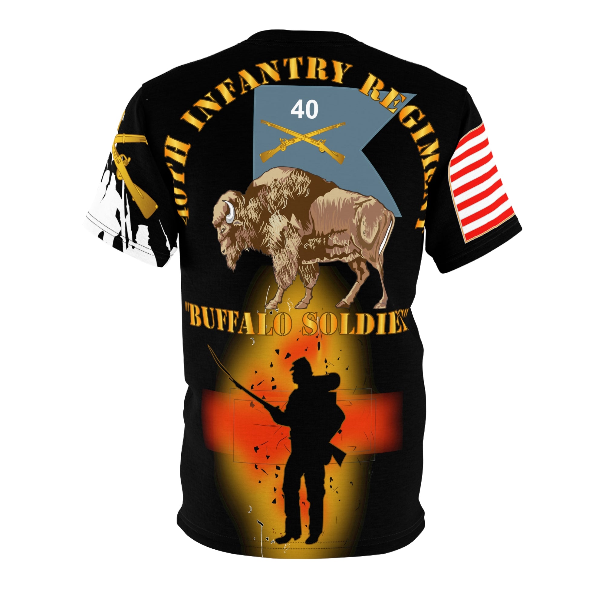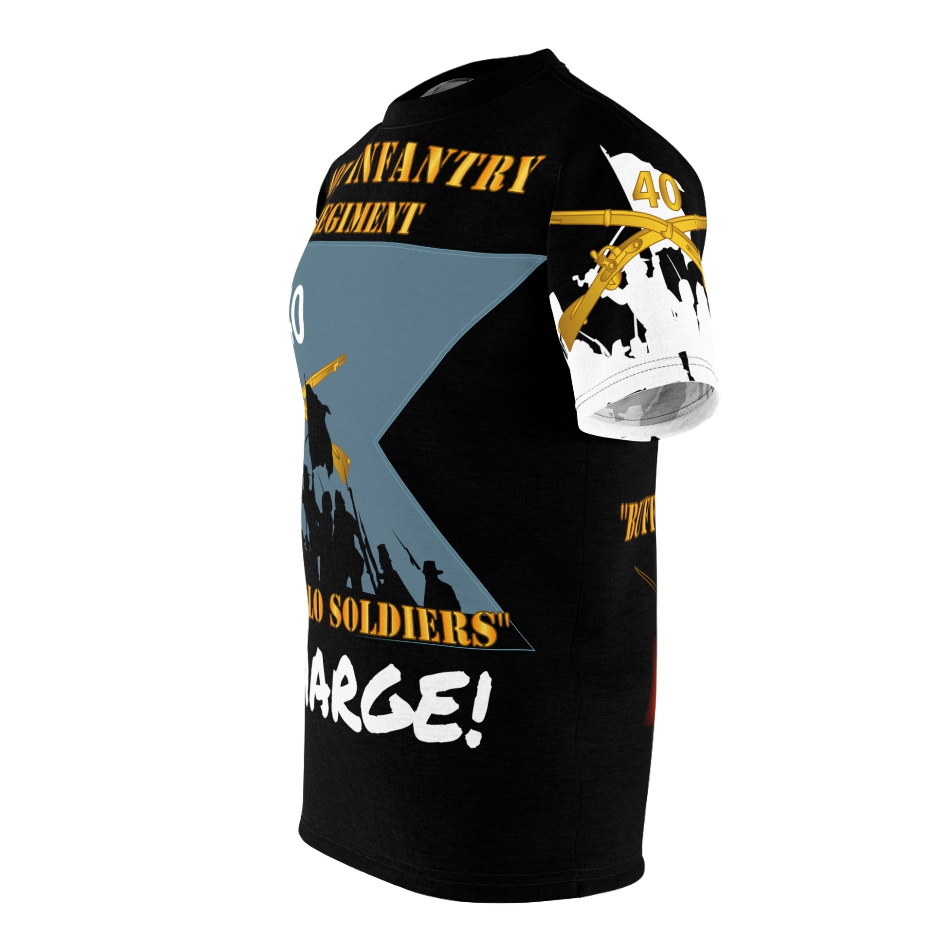 AOP - Army - 40th Infantry Regiment on Guidon with Bayonet Charge - "Buffalo Soldiers" .: 100% Polyester .: Light fabric (4.0 oz/yd² (113 g/m²)) / (6.0 oz/yd² (170 g/m²)) .: Regular fit .: Runs true to size