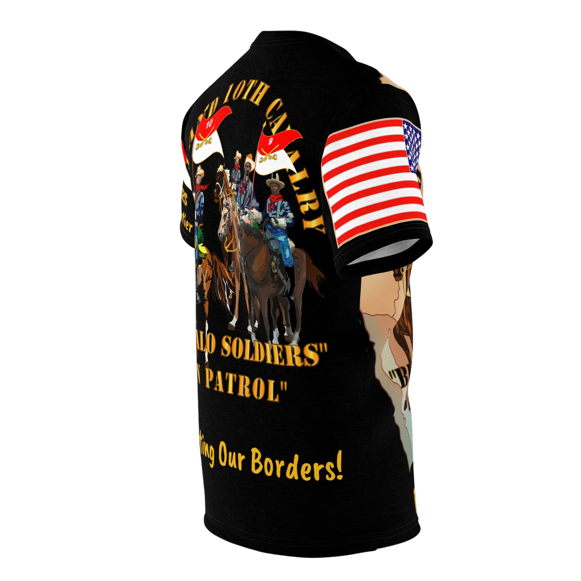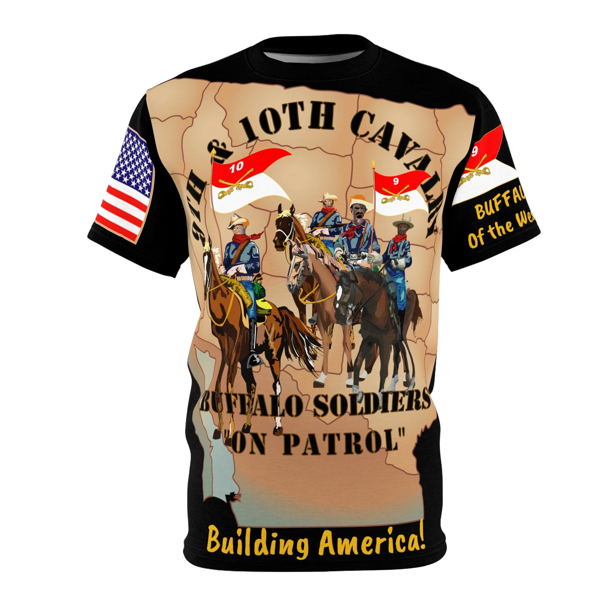 AOP - Army - 9th and 10th Cavalrymen - Buffalo Soldiers - Building America - Protecting Borders! .: 100% Polyester .: Light fabric (6.0 oz/yd² (170 g/m²)) .: Regular fit .: Runs true to size