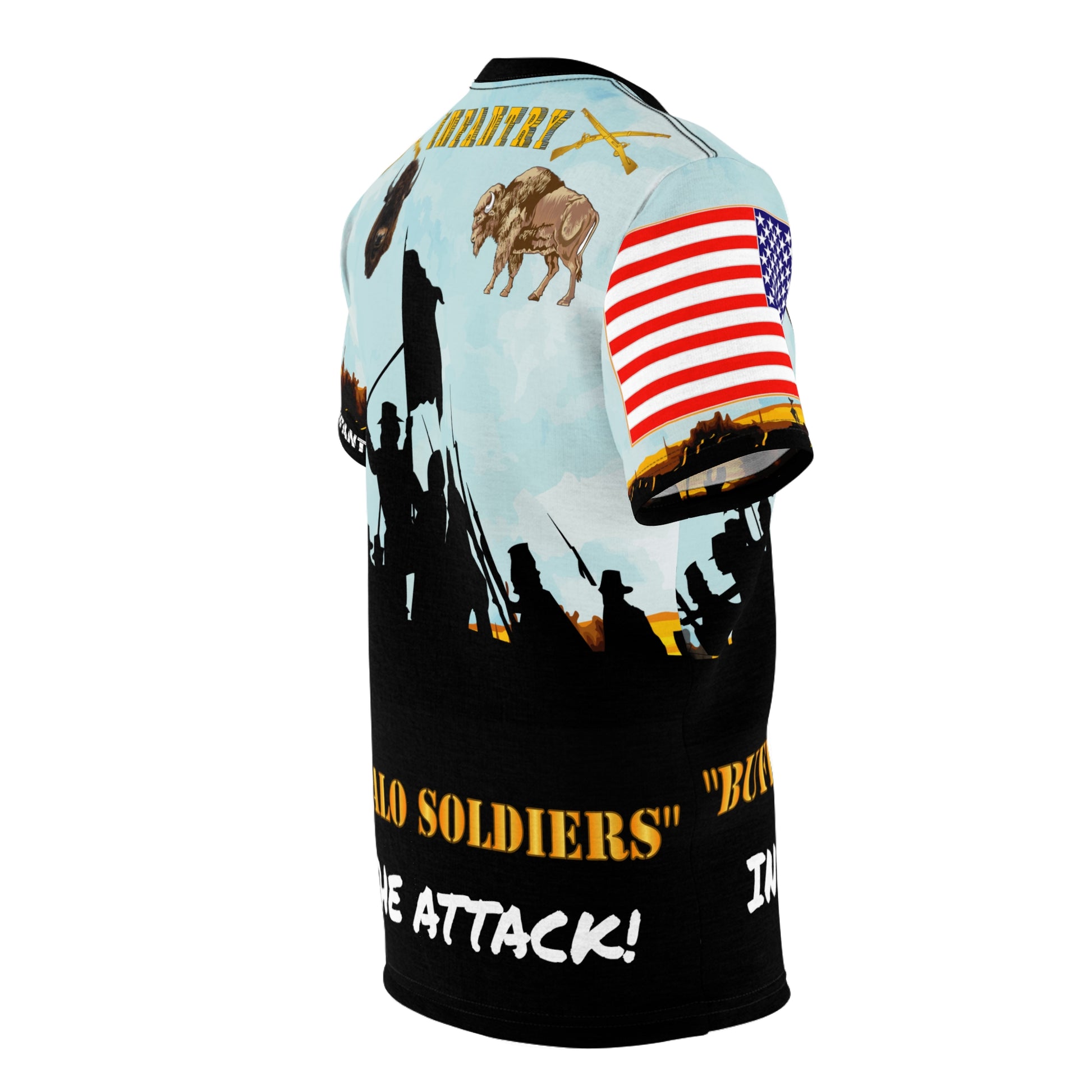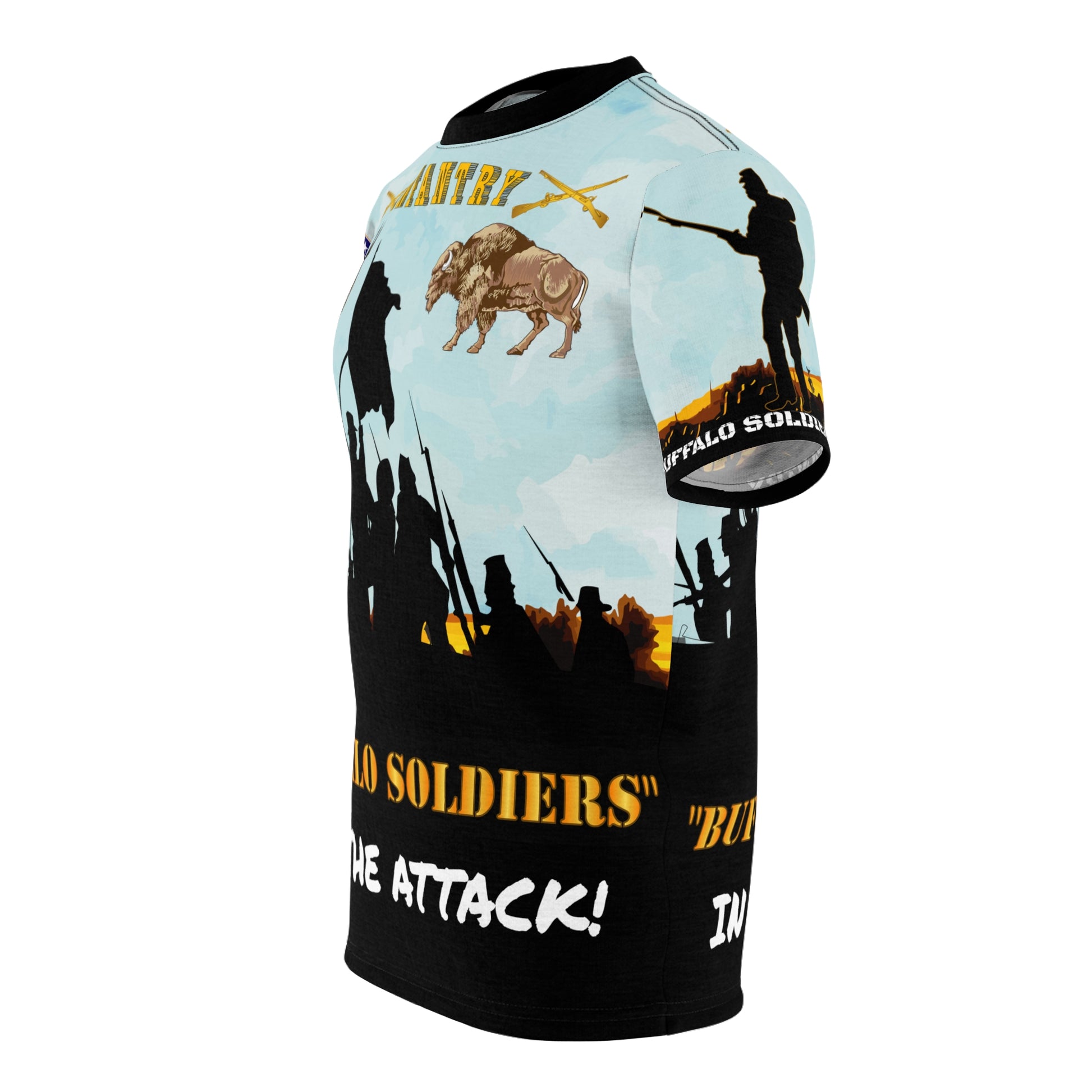 AOP - Army - Western Buffalo Soldiers (Infantrymen) in the Attack! .: 100% Polyester .: Light fabric (4.0 oz/yd² (113 g/m²)) / (6.0 oz/yd² (170 g/m²)) .: Regular fit .: Runs true to size