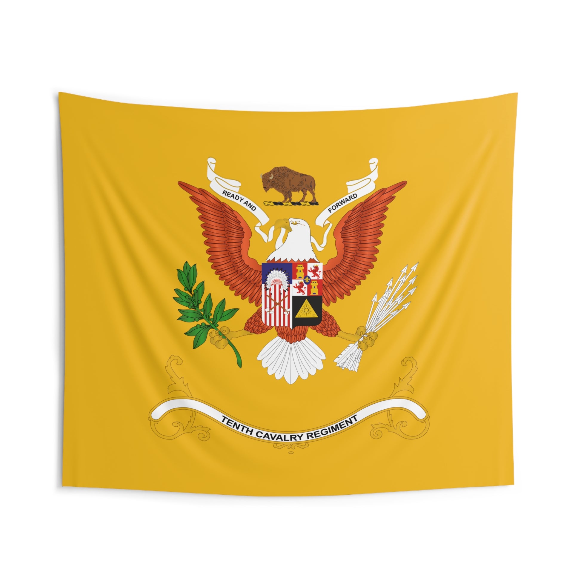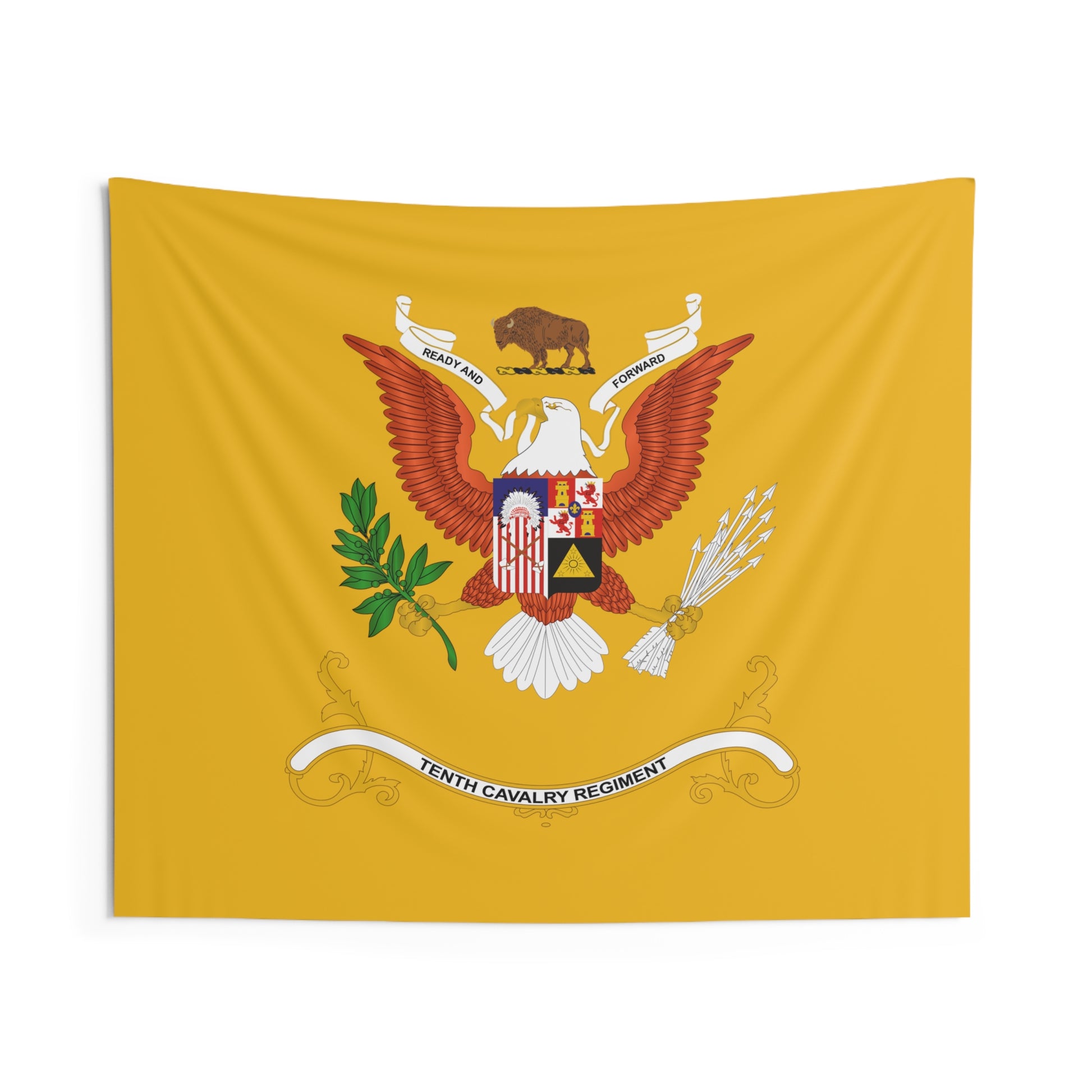 Indoor Wall Tapestries - 10th Cavalry Regiment - Buffalo Soldiers - Regimental Colors Tapestry A custom wall tapestry is a surefire way to uplift any room’s aesthetics with a personal touch. This 100% Polyester wall tapestry comes with hemmed edges for extra durability while its mildew and water-resistant properties ensure years worth of decorating bliss. The advanced tapestry printing techniques guarantee crisp detail even for the craziest of designs, in any of our multiple size choices. .: 100% Polyester .: Water and mildew resistant .: Multiple sizes (26x36 in, 51x60 in, 68x80 in, 88x104 in)