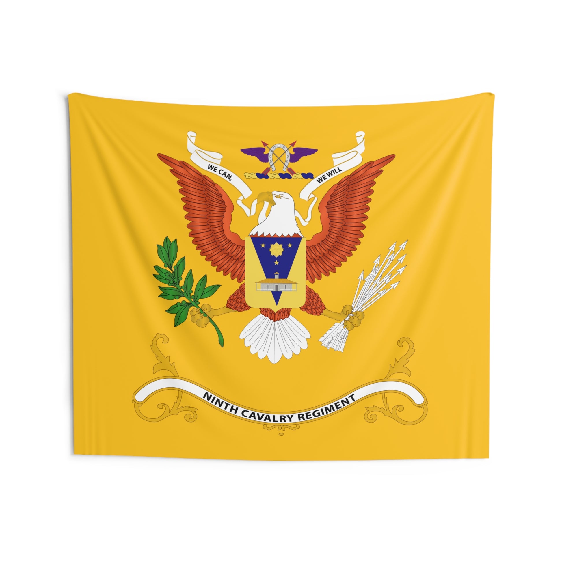 Indoor Wall Tapestries - 9th Cavalry Regiment - We Can, We Will - Regimental Colors Tapestry A custom wall tapestry is a surefire way to uplift any room’s aesthetics with a personal touch. This 100% Polyester wall tapestry comes with hemmed edges for extra durability while its mildew and water-resistant properties ensure years worth of decorating bliss. The advanced tapestry printing techniques guarantee crisp detail even for the craziest of designs, in any of our multiple size choices. .: 100% Polyester .: Water and mildew resistant .: Multiple sizes (26x36 in, 51x60 in, 68x80 in, 88x104 in)