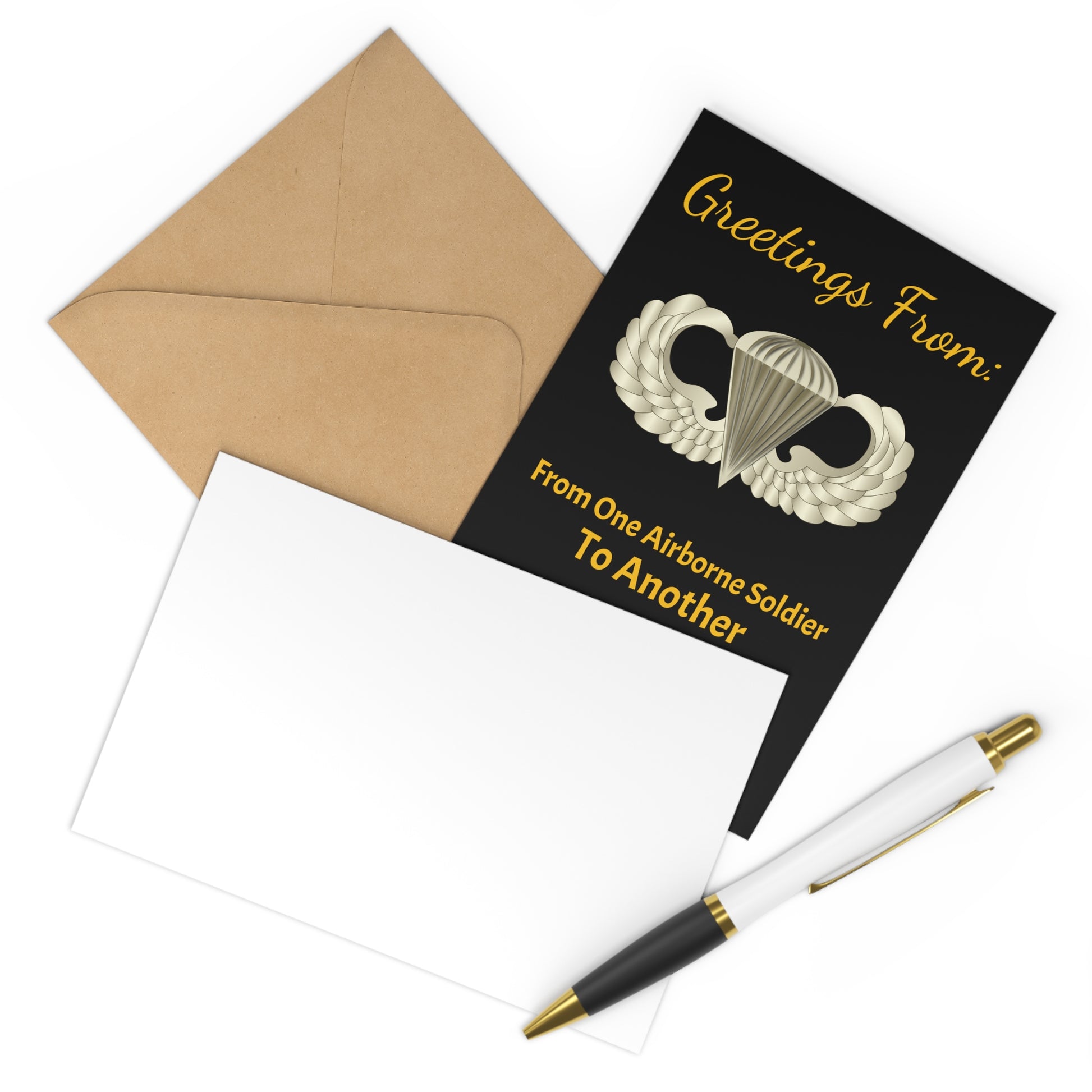 Postcards (7 pcs) - Greetings from: One Airborne Soldier to Another - Best Wishes Create memories from your travels with this 7-piece postcard set. They come in Black with a matte finish. Craft paper envelopes are included to make it easier to send them while you continue your adventures around the world. .: Matte finish .: 7 pieces per order .: Craft paper envelopes included