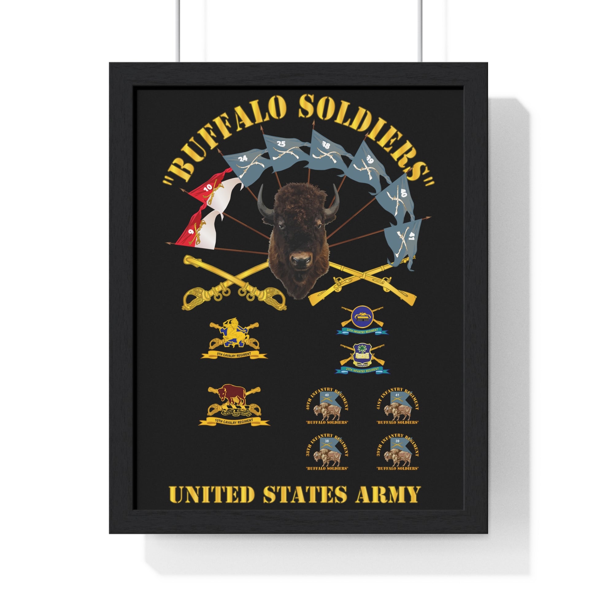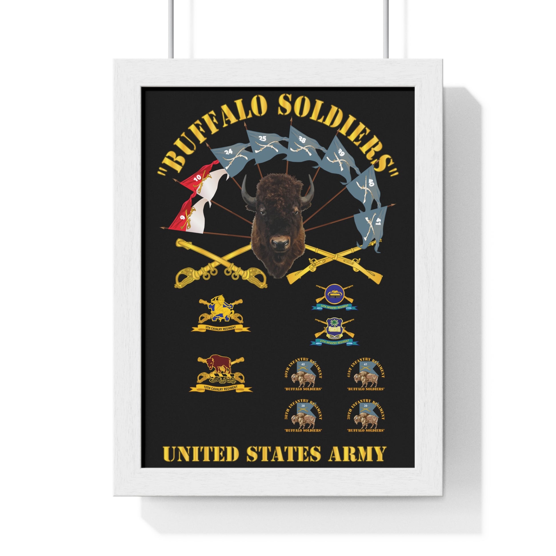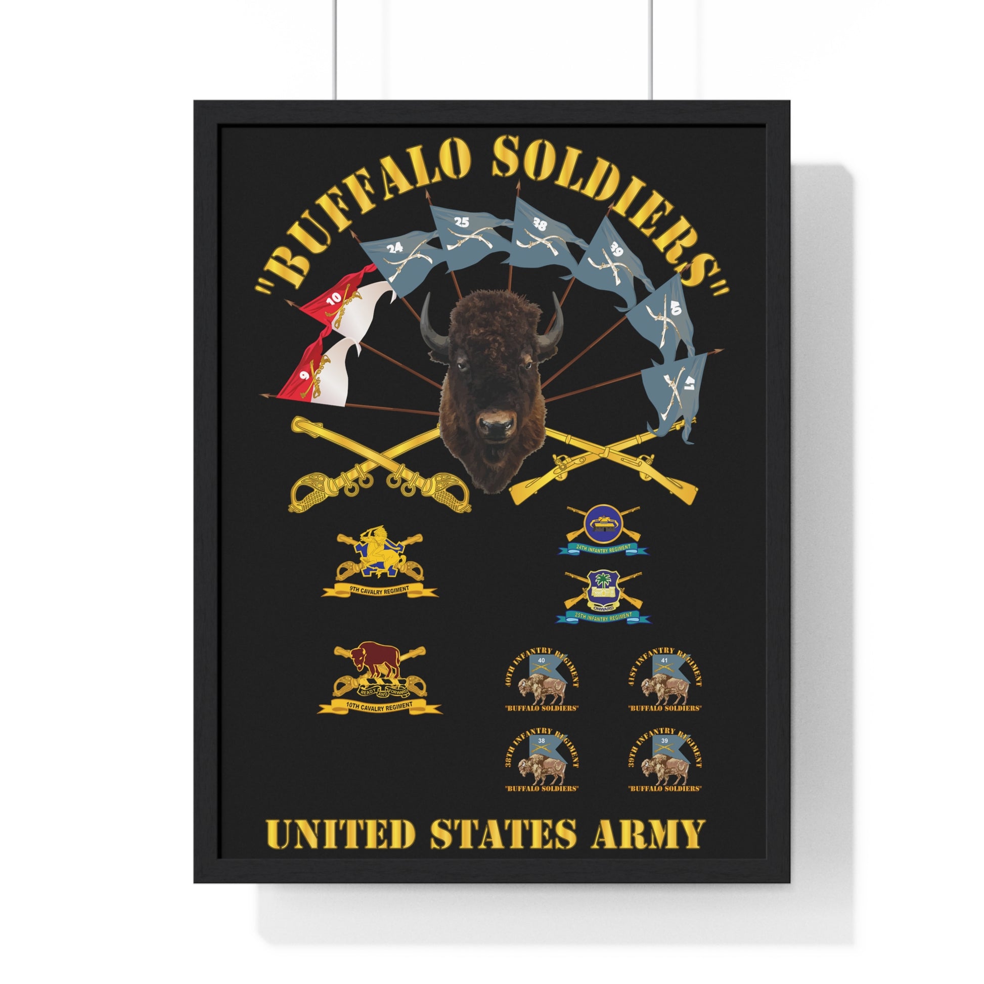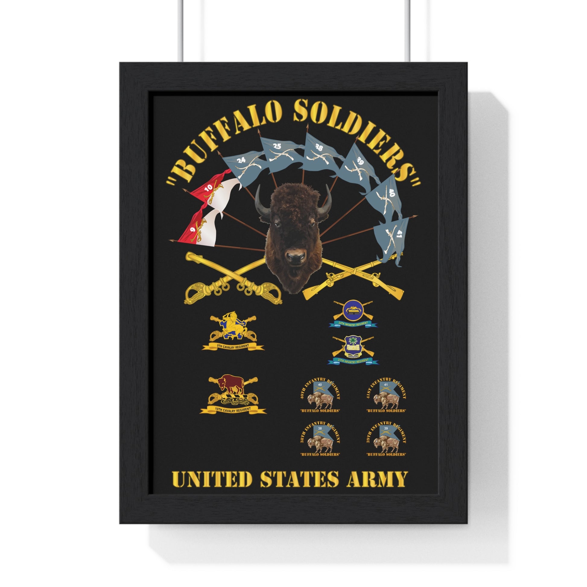 Premium Framed Vertical Poster - Buffalo Soldiers - Infantry - Cavalry Guidons with Buffalo Head and Unit Crests - US Army
