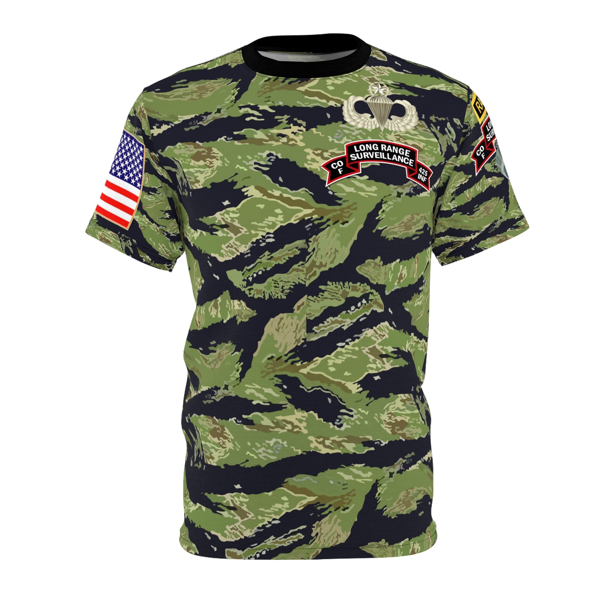 Unisex AOP Tee - F Company, 425th Long Range Surveillance (RANGER) - Military Tiger Stripe Jungle Camouflage w Jumpmaster Wing